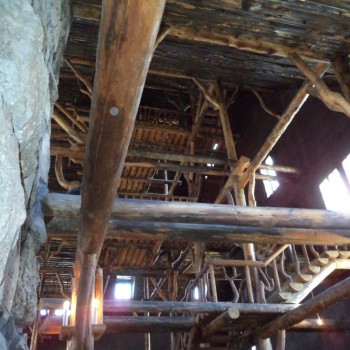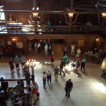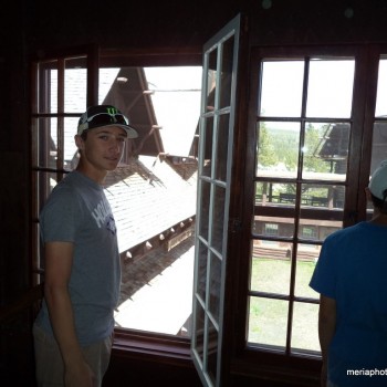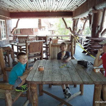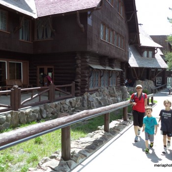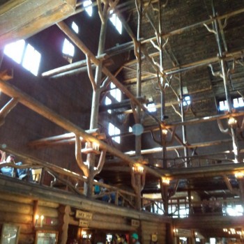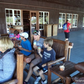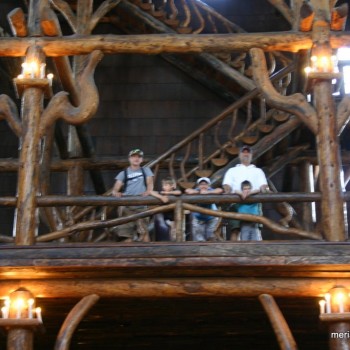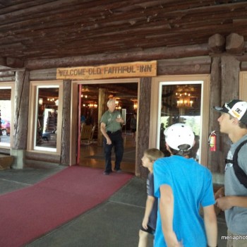 After finishing the trail, we visited the “Old Faithful Inn”, a really spectacular building. Someone at the park suggested that we should watch Old Faithful erupt from the deck of this lodge. So we checked it out. The entire place was constructed using trees from the park. It was really something. We got ice cream and headed up to the outside deck. Old Faithful was late again, but definitely worth seeing twice and from above ground.