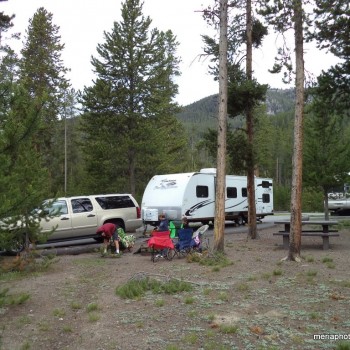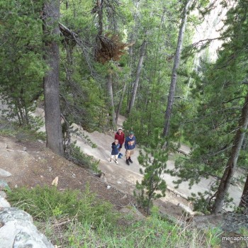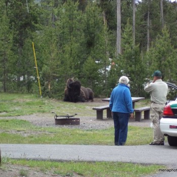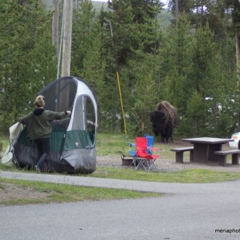 On the way back to our campsite through some trees, we saw a bison walking past the stream about 100 feet or so. Morgan and Tyler wanted to race back to the campsite so they split in two directions. As the rest of us caught up to them near our site, we saw a crowd of people and a ranger patrol car – must be wildlife! Yesterday evening when we arrived at the campground, we were speaking to another guest who told us that a bison had walked right down the road through the campground between her site and ours. I thought that would be pretty cool, and it looks like I sort of got my wish! A bison had decided upon a spot near some pines to hang out. The ranger was using a bullhorn and siren to encourage the bison to move, but he wasn’t having any of it. The owners of that tent were packing to leave anyway, so they just moved their tent a little sooner. Then the bison dropped down for a rest After a few more minutes and lots of photos, everyone just went back to their own business. We left after about 45 minutes to go sight-seeing and he was still there when we passed by on our way out.