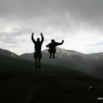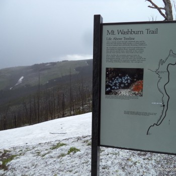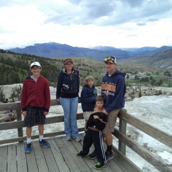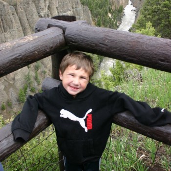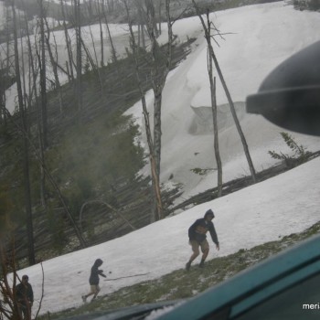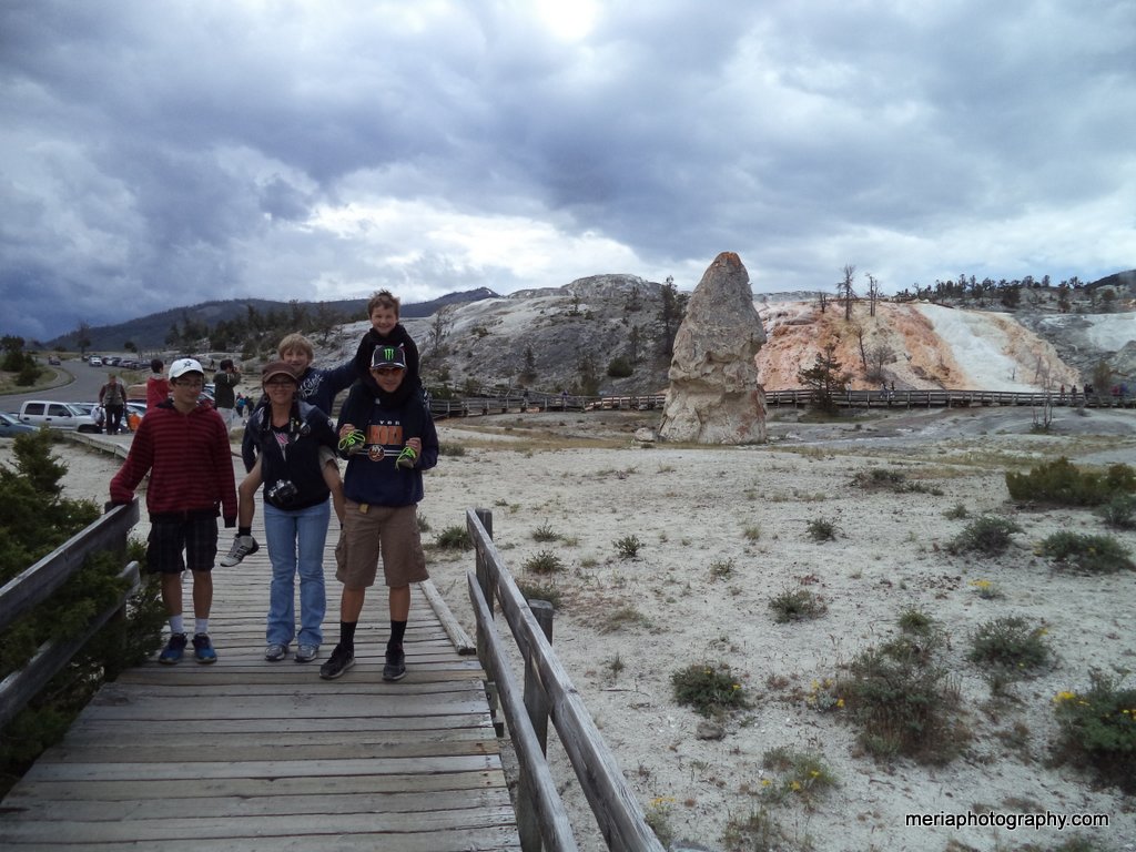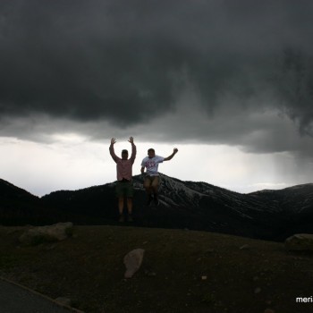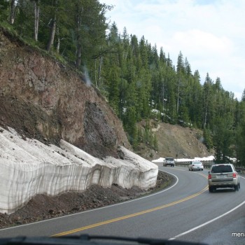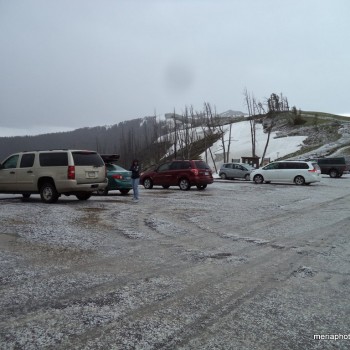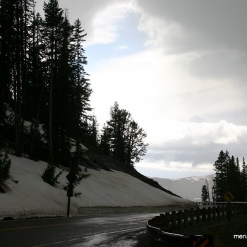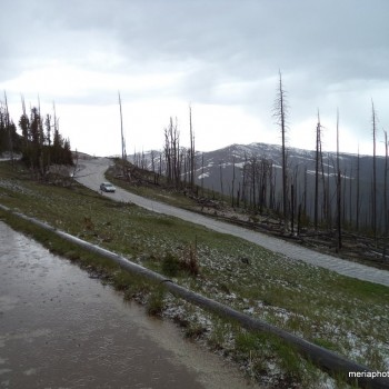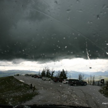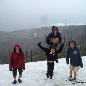 So about that storm that we sort of beat back at the Hot Springs…we chose a new road to take us back to the campsite, Tower Falls route. It took us up the a really high area, just as the storm was approaching. We watched it come over the mountains towards us, and that was really cool. So we backtracked a bit to a dirt road that went to the top of the mountain we were on, Mt. Washburn. At the time it was raining, but as we got about midway up, it began hailing! It was crazy – we parked under some pines for some shelter. It turned back to rain so we continued up the hill. We were passing lots of snow patches. At the top, the boys got out of the truck in the rain and went out onto the snow. If it wasn’t raining, we would have taken the hiking trail up to the tip-top of the mountain, so instead we just took some fun pics.