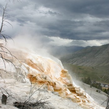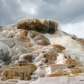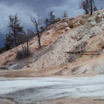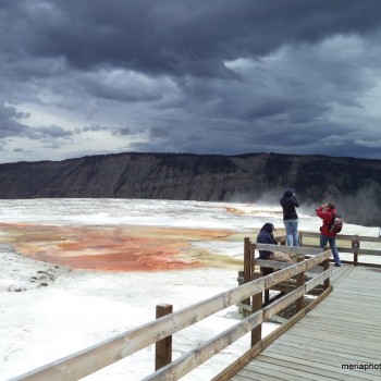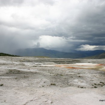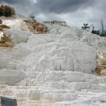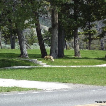 Mammoth Hot Springs was packed. The sky was patchy and overcast, and that made for a really dramatic effect. The springs have so much calcite that it turns everything white. When the trees’ roots tap into it underground, it soldifies the tree. The entire place looks as if it’s under a fresh snowfall – beautiful! The sky looked like a storm was on it’s way so we tried to beat it back. We did beat it for that time. On our way out of the area, we saw a fox wandering around town.