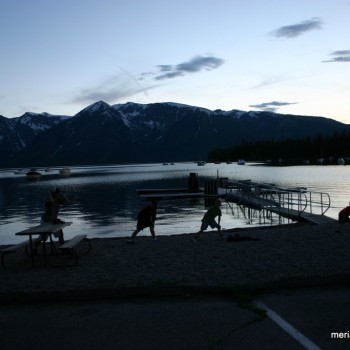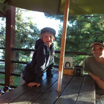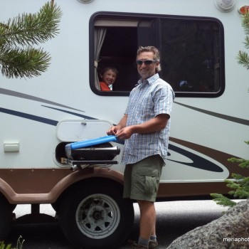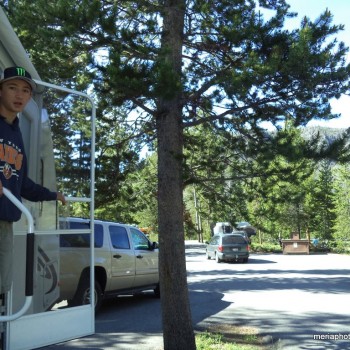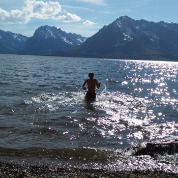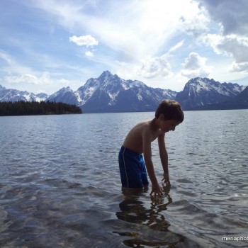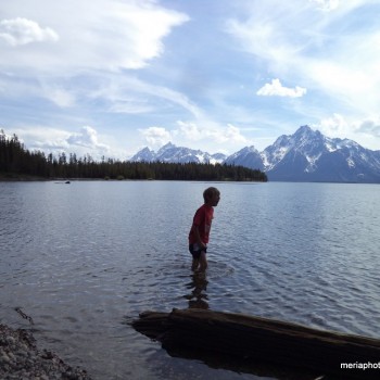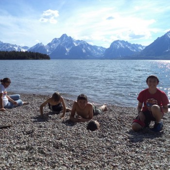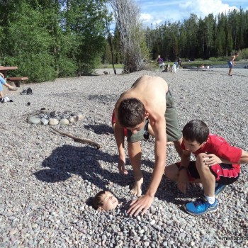 We weren’t able to get full hookups so that meant 4 days, no showers. Oh well. We parked our camper at the Colter Bay Campground then drove around to check out the place. We found an entrance to the beautiful Jackson Lake just up and around the corner. Rocky beach and bottom, and clear COLD water against the backdrop of the Grand Tetons. Steve and the kids took turns challenging themselves to get in while I just hung out and watched – too cold for me! And it was Gabriel’s idea to be buried in the rocks – kind of like burying yourself in the sand at the beach. 🙂
