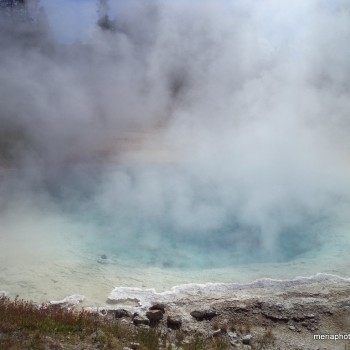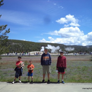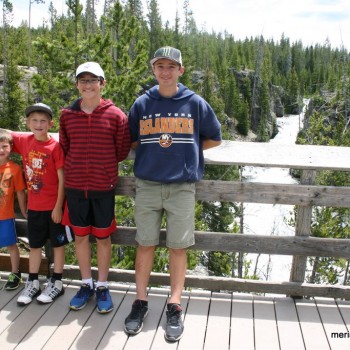 On the way out of Yellowstone we stopped again at the Old Faithful area. My phone picked up signal there so Steve was able to spend some time catching up on business. The kids and I went to the gift shops and the Inn in the meantime. We didn’t realize it at the time, but Gabriel left his favorite Puma hoodie there. On our way out of the Inn to go back and meet up with Steve, we saw that we’d just missed Old Faithful. It figures – the last two times we were standing there waiting for it, it was 10 minutes late. This time, it was 10 minutes early! On our way we saw another waterfall area, so we stopped to check it out. A funny memory here: the kids asked about lunch, so right there in the pull-off parking lot Steve sparked up the grill for some hot dogs. Probably we weren’t allowed to do that, but just for once it was fun.
