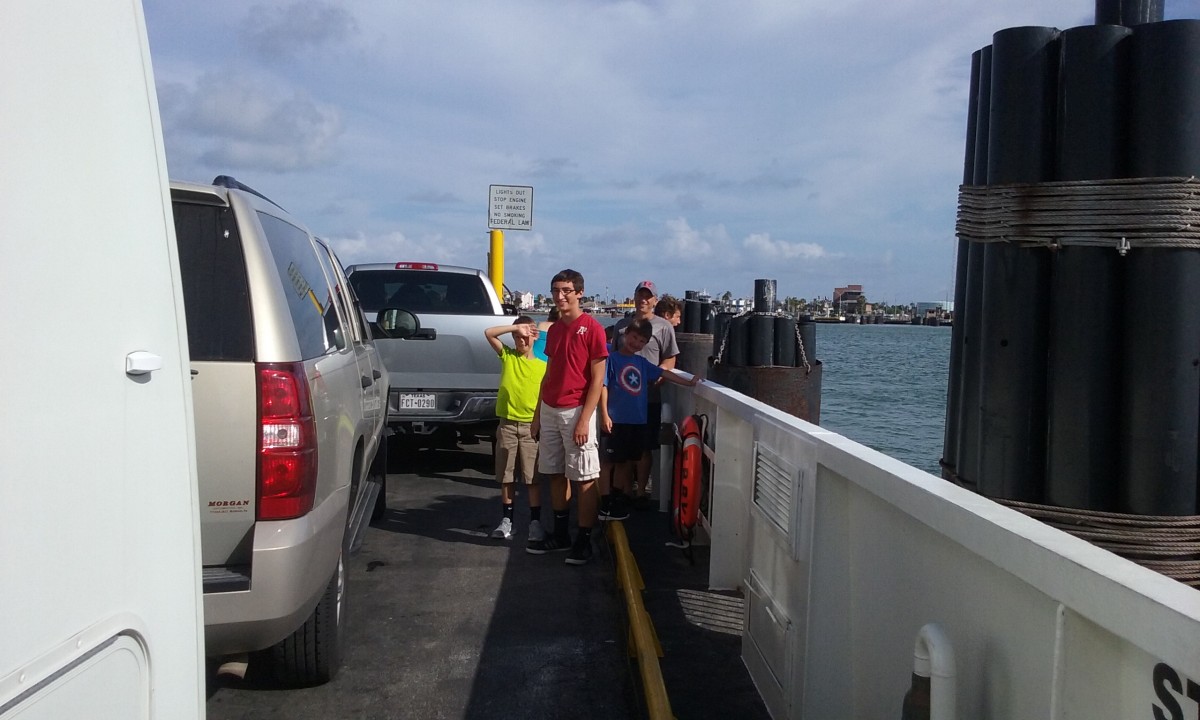We finally board the ferry, and I make all the kids get out of the truck (just in case we sink).  No sooner the ferry pulls away from the dock, it stops to let another freightliner cross from the other direction.  I wasn’t able to get it in the picture, but there were a few porpoises alternately jumping out of the water in front of the freightliner, as if guiding it through the channel.