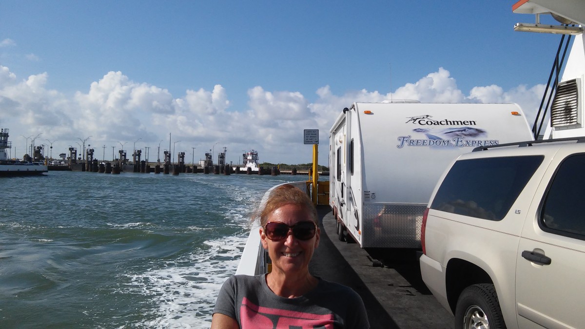 As usual, Steve and his GPS continue their love/hate relationship.  Somewhere on the way without realizing it, our route changed on our GPS to include a ferry trip.  Given the choice before, neither of us would have chose that route – we both we pretty anxious once we realized we were about to do just that.  Was it even possible to take a camper on a ferry?! We quickly called the campsite to make sure, and they said, “Yes, that’s fine!”  Ok!  So we are waiting in line, nervous but excited…and here comes a freightliner, ready to pass through the same channel that we were waiting in line for the ferry to cross!