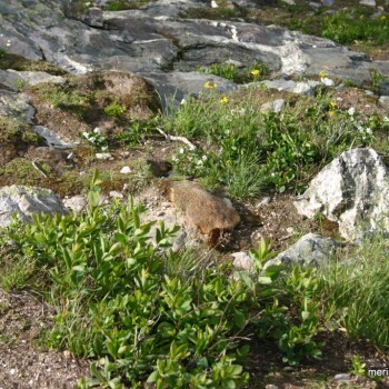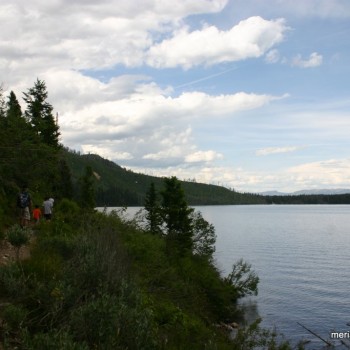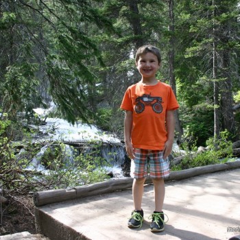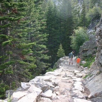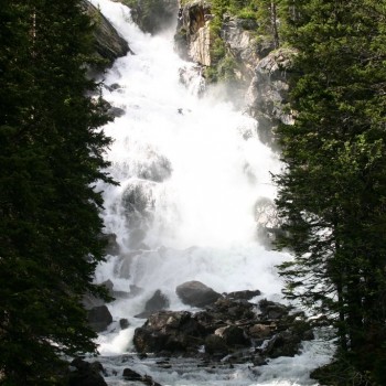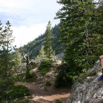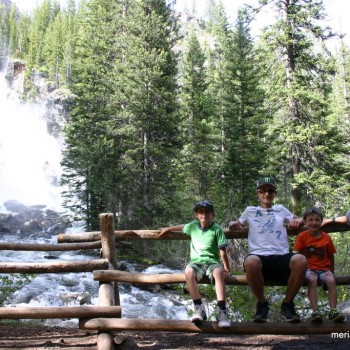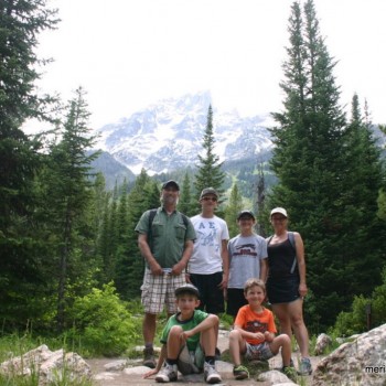 When we began planning this trip, Steve stumbled across a website put together by a family who had taken a cross-country trip every year since 1999. We read through some of the trips and recommendations of where to go and what to see, and one of them was the “Jenny Lake hike”. Since arriving in Grand Teton, we’d heard of a few bear sightings and there were warnings posted everywhere. Even the day we arrived at the campground there was a sighting not far from there. We didn’t know how populated the trail would be, so we broke down and bought the special “bear spray” for $49.95. On the way to the trail I’m reading the packet info that came with the spray and I’m about ready to back out of it – scary!!! We get to the trail-head and there were like a billion people there, so we really didn’t need the spray after all – better to have it and not need it though. The hike was about 1.5 miles and relatively easy, going along part of the lake and then ascending up about 1000ft past Hidden Falls up to Inspiration Point to finish at 7,100 ft. No bears, but we did see an American Pica (looked like a huge hamster), some chipmunks at the Falls, and a Badger at the top of the trail. There was a point in the trail that went along a rock cliff, and I realized there that I have a little fear of heights – I couldn’t bear to let go of the rock wall long enough to get a picture – but it was a really beautiful trail and well worth it anyway. We weren’t as high up the mountain as we felt we were, but the views of the lake and the surrounding area and the scattered snow patches were stunning.