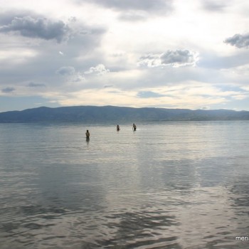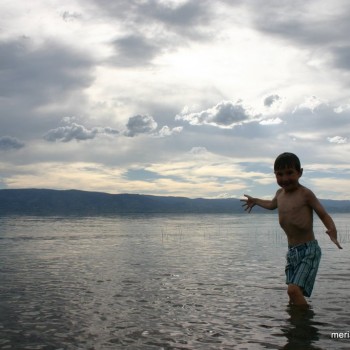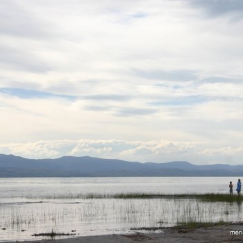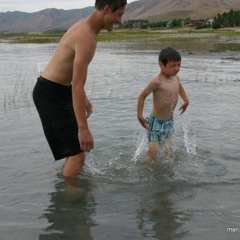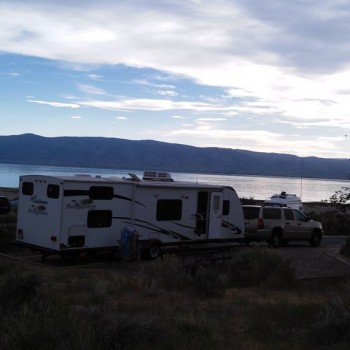 The day was overcast so the color of the lake wasn’t so much turquoise, but the place was perfect. We didn’t have reservations, but each site had a post with the site number and the next two reservation dates and last name, and it turned out that we were welcome to just find a spot that wasn’t marked reserved already and park there. It was only $20.50 a night, with water and electric, and it was basically on the beach! It was perfect. It was great for Gabriel because it was shallow for a long distance, so he was able to feel like he was really far out in the lake. We enjoyed exploring, and we found a fish skeleton. The lake was said to have only 4 different kinds of fish, 2 of them only known to this lake. According to the info board posted about the local fishing, I think the fish skeleton was a cutthroat trout, and it looked to be about 12-15 inches long.