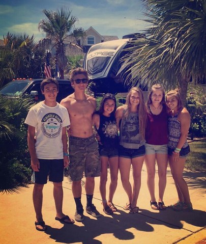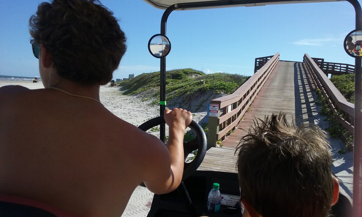 Back at the site, we piled our stuff onto the golf cart, then had Morgan drive us all to the beach. He and Tyler and Christian had made friends with a group of girls who were there for a soccer tournament. Morgan drove them around the beach and up into town…