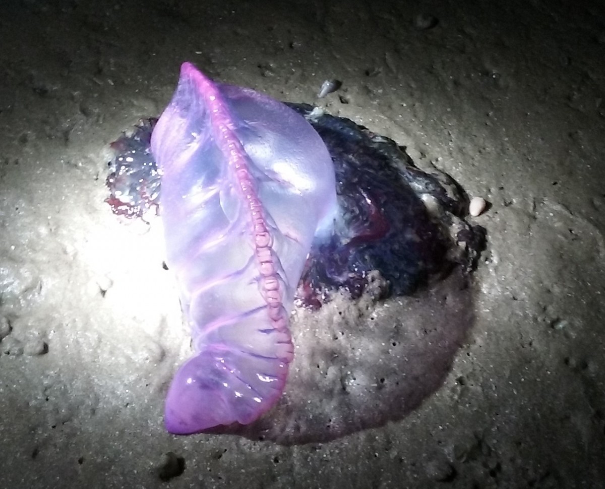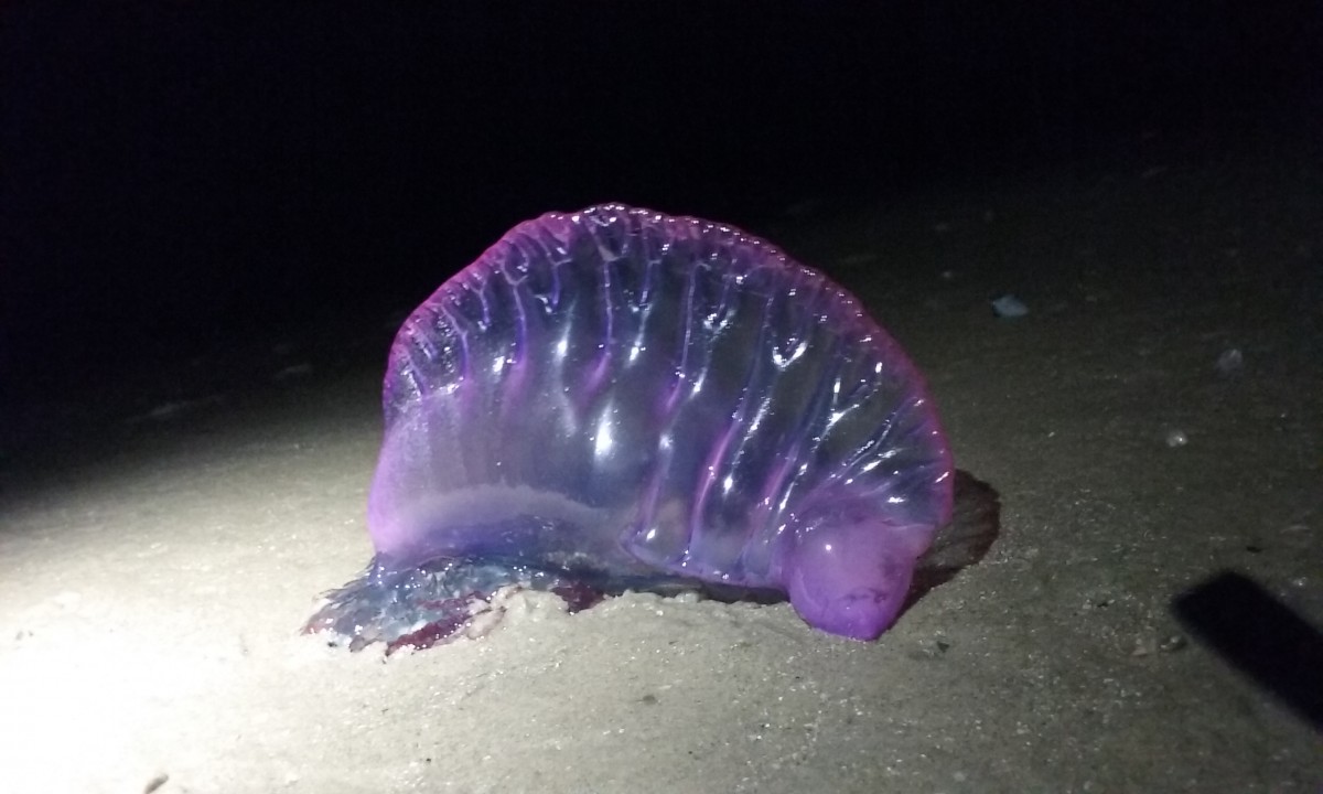 I’d also read some mention of man o’war jellyfish being native to this area too, mostly because of the warm temps of the water. I’d never seen one in real life – and certainly would never want to anyway, but you never know what you’re going to find at night. We actually found 5 of them – fortunately they were dying on the beach and not swimming in the water near us earlier that day!