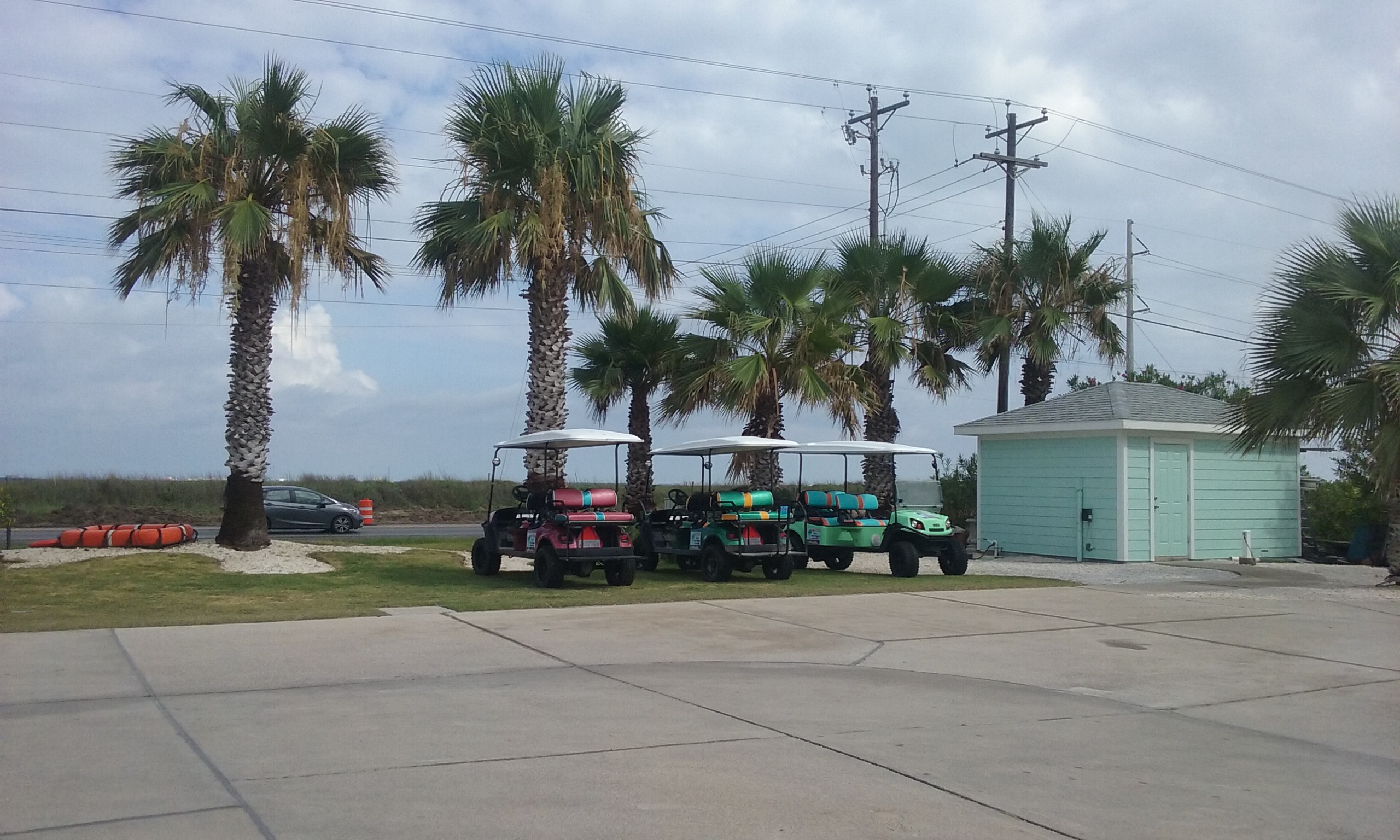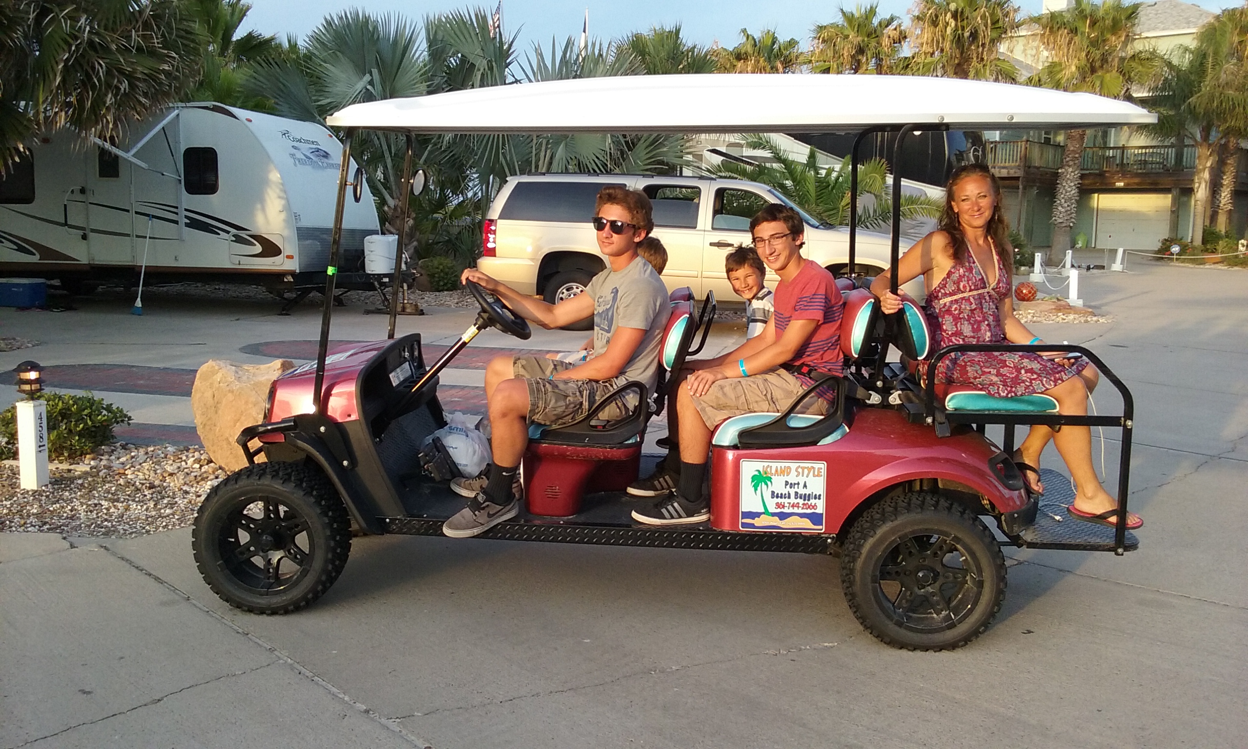 Back to our site to wait until 8:30. Everyone at this place had their own golf carts or rentals. It’s cool to have a golf cart to get around in any campsite, but the icing on the cake is when you can drive it on the beach and in town too. The only restriction was not to drive on the main road (50mph) just outside the resort, but you were allowed to drive the carts down the length of the beach 5 miles north to enter into town that way. So the rental was for 24 hours, and we…were…psyched! I walked to the office to pick it up that morning…
