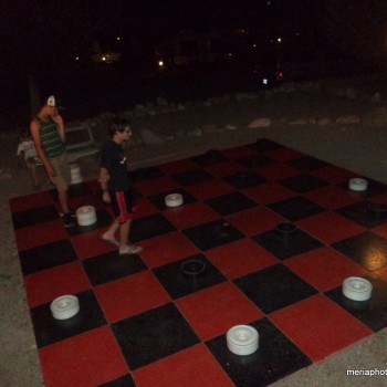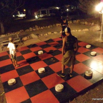 Back at the camper, the kids and Steve walked around and found a people-sized checkerboard to play.