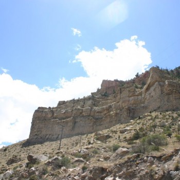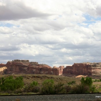 It continued to be a pretty drive through the city but got hotter and more barren as we reached the desert. Maybe it’s my age, but for me the desert heat is only bearable when there’s a body of water to cool off in. It was a long, hot, trip to Arches. Maybe the sight of the desert actually makes you more thirsty. It hovered around high 90’s. The truck was running fine but we kept cycling off the AC so we stayed just under the danger zone to avoid possibly overheating. It was bad enough driving in almost 100 degree weather – none of us wanted to be standing still in it for more than 10 minutes. Thank goodness for our camper fridge/freezer and the waters we packed in there. Tyler wasn’t interested in my idea for a cool drink, but later on he came around and did the same thing.