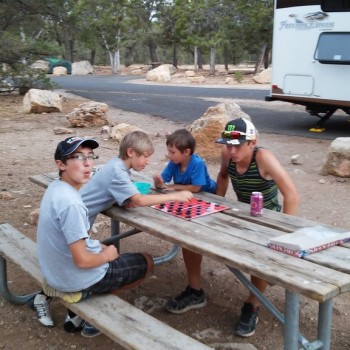 Dinner back at the campsite and a few games of checkers…and those Ravens outside picking up some leftover rice from dinner.