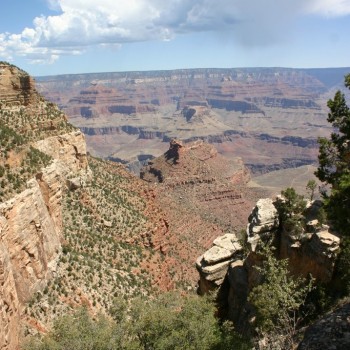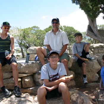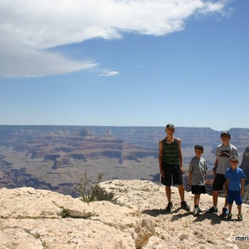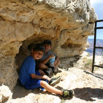 A little breakfast and we are were ready for some sightseeing. Really cool thing about staying in Grand Canyon was that they had shuttle buses you could use to see the park. So we walked up to the main entrance from our campsite and boarded a bus. We took one route to another route that stopped at about 7 scenic overlooks of the Canyon. We were able to get off the bus at each stop, take in the view, walk around a little and then catch the next bus. They ran about every 10 minutes so you could catch them at about any time. You could walk from stop to stop on a paved trail that went the entire route as well, and we did that once between two of the stops. It was nice to board the bus and get right into some air conditioning after being in the heat. We carried our lunch with us so that we could stop to eat wherever we wanted. Even though each stop was just another view of the Canyon, the change in perspective was picture-worthy.