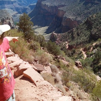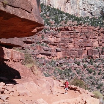The plan was to do at least the 1.5 mile hike down into the canyon (3 mile round-trip). Majority of the people we were passing as we were going down weren’t looking like they were enjoying the hike back up much. One woman we talked to said she started her hike at 5:15 that morning. Oh boy – losing my confidence here with the heat and the thirst and the dusty red trail. I was starting to feel like “Pig Pen” from the Snoopy cartoon, with the cloud of dust surrounding my feet and following me wherever I walked. All of our shoes and ankles were dusty red. Did I mention it was really hot too??