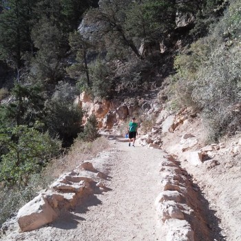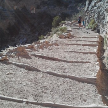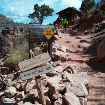 Since the temperature easily seems to hover near 100 where we are, we wanted to get up and out early to start our hike. By 7:30am, we were already making our way down the Bright Angel Trail into the canyon (I know, that’s not really very early but give us some credit here for trying!). It was such a different hike than any other we’ve ever done since you start out going down to your destination instead of up. It was a nice hike for the most part – not paved, but the edges were lined with larger rocks while the trail was either sandy or a little rocky, and there was an occasional “tunnel” to pass through. It was also wide enough in most areas that you didn’t feel like one slip and you would be rolling down the canyon walls to the bottom.