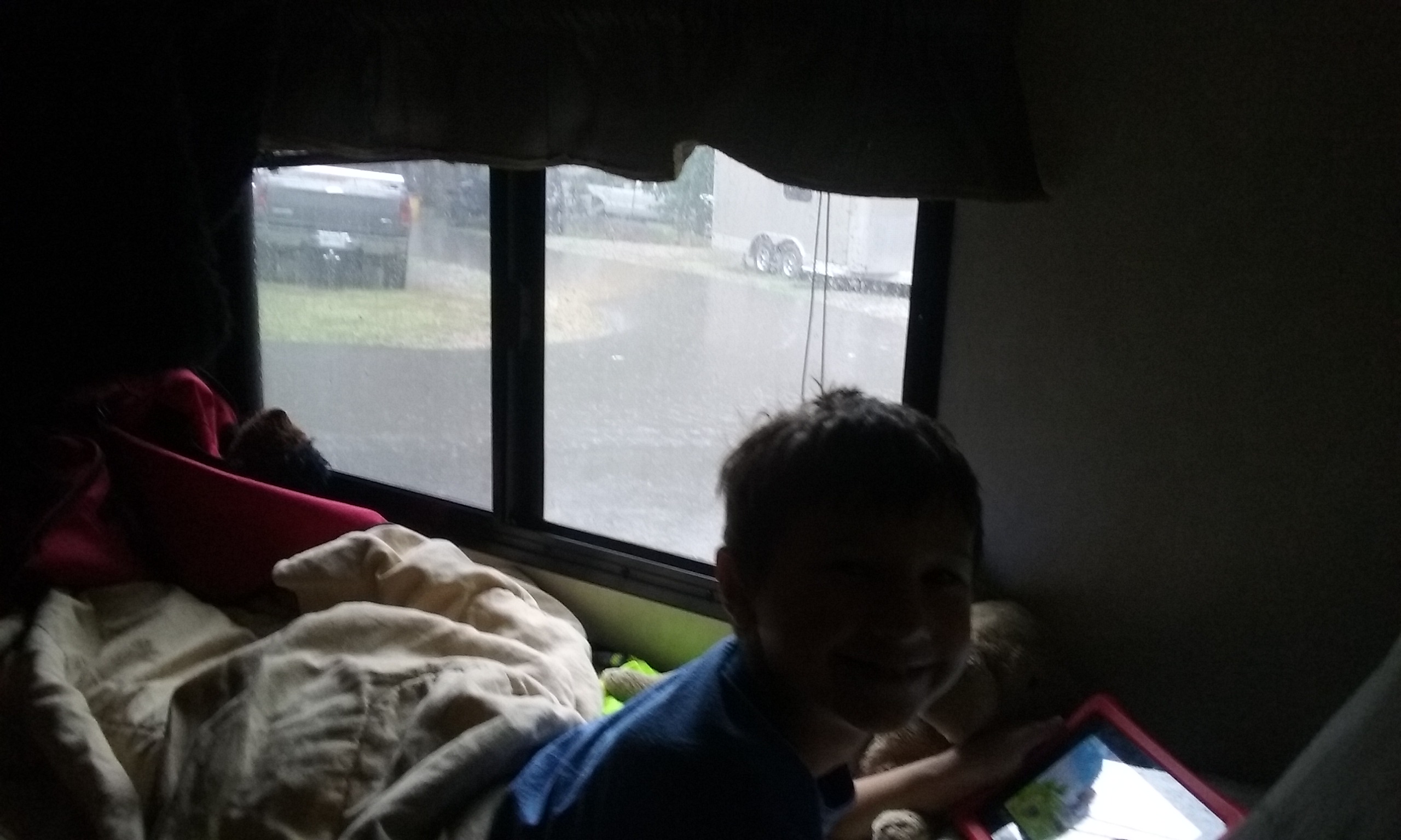 We woke up to a heavy rainstorm, which was kind of ok since it matched my mood about our trip being just about over, but not Gabriel’s – he’s always happy!