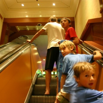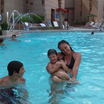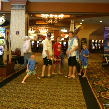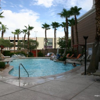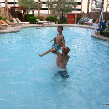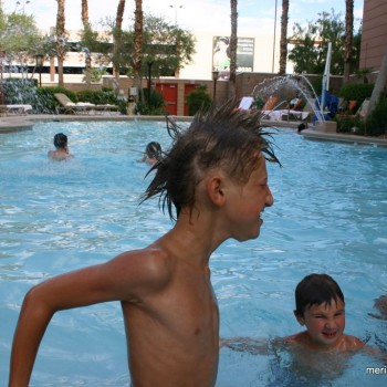 Town hotel pool as well as the campground one. So we took a walk over. This place was completely “Vegas” – we walked through a parking deck, into the building a through part of a casino, some fast food shops, a movie theater, more casino, an atrium with waterfalls, more restaurants, a mall, and even a lower level bowling alley! It was crazy – these places in Vegas spare no expense. Finally we found the outdoor pool. Really felt like we were at a beachy resort!