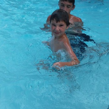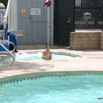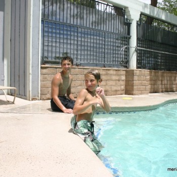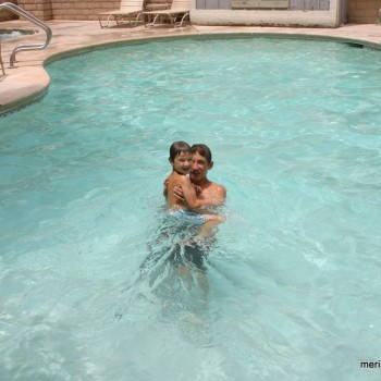 Breakfast and then right over to the pool. Gabriel was doing even better swimming without his floaties – he even went underwater from one side of the 5′ to the other after jumping in! He’s a little fish just like his brothers.